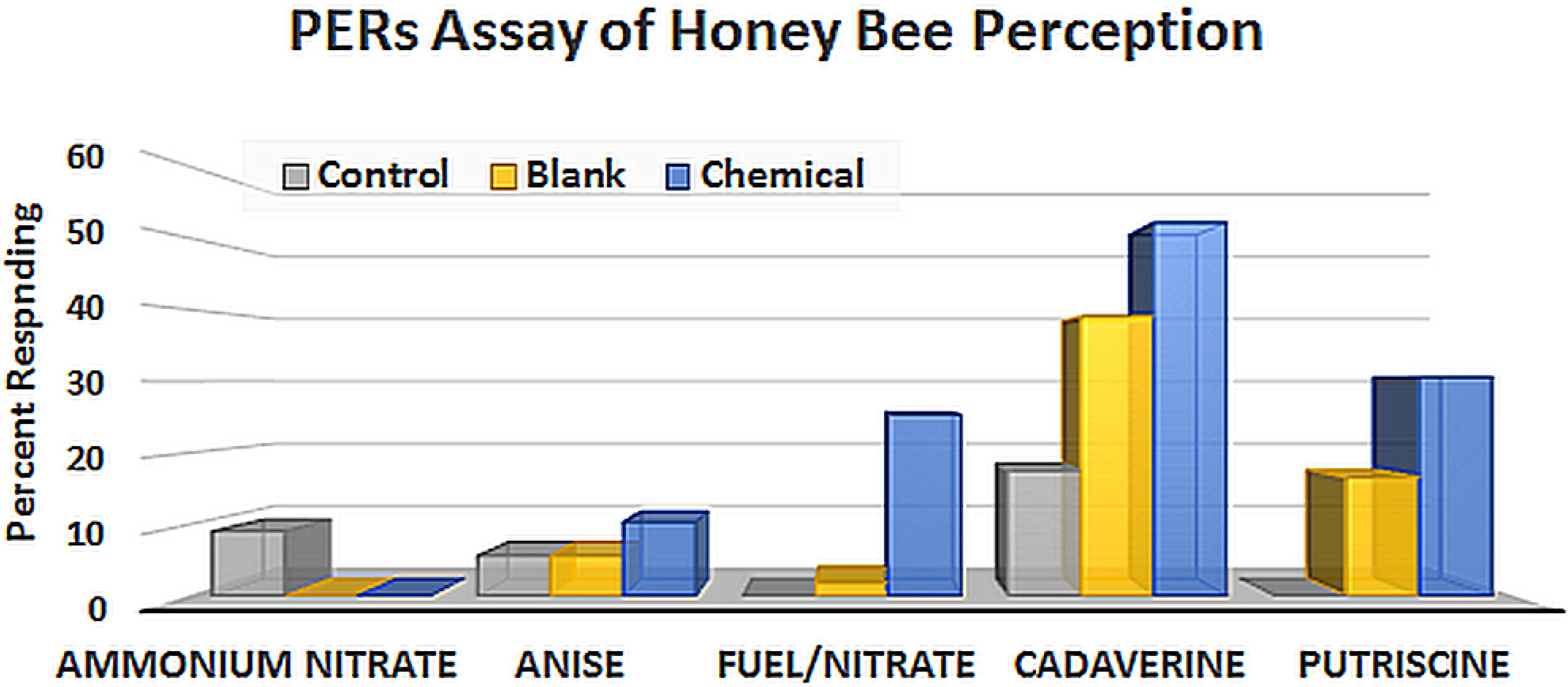 PERs has typically been used to study associative learning in honey bees, especially with respect to floral scents. More recently, the method has been extended to studying the effects of pesticides on learning [34,35], and the following chart (Figure 1) presents PERs results for a sample of novel compounds that can be detected by bees at low concentrations. This data is from a short trial from our military studies whereby chemicals associated with dead bodies (cadaverine, putrescine), fertilizer-based Improvised Explosive Devices (IEDs) (fuel/nitrate), and fertilizer (ammonium nitrate) are compared to anise, a plant attractant to which bees are readily conditioned.