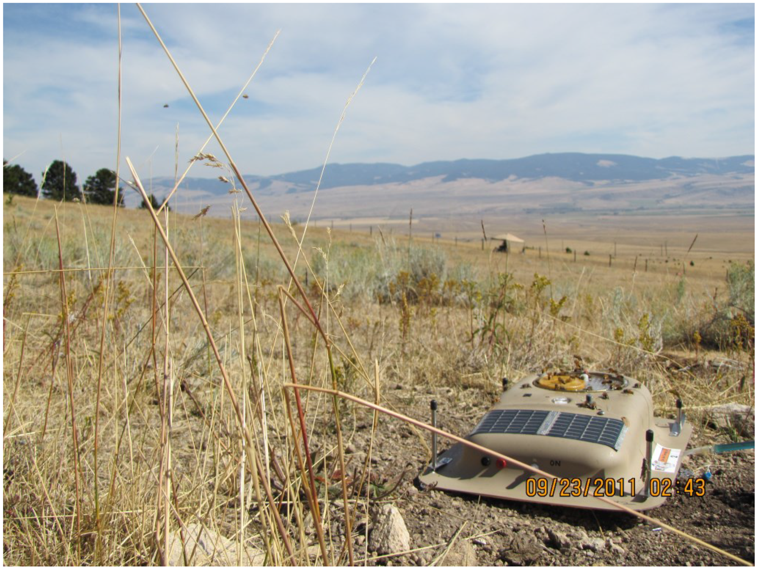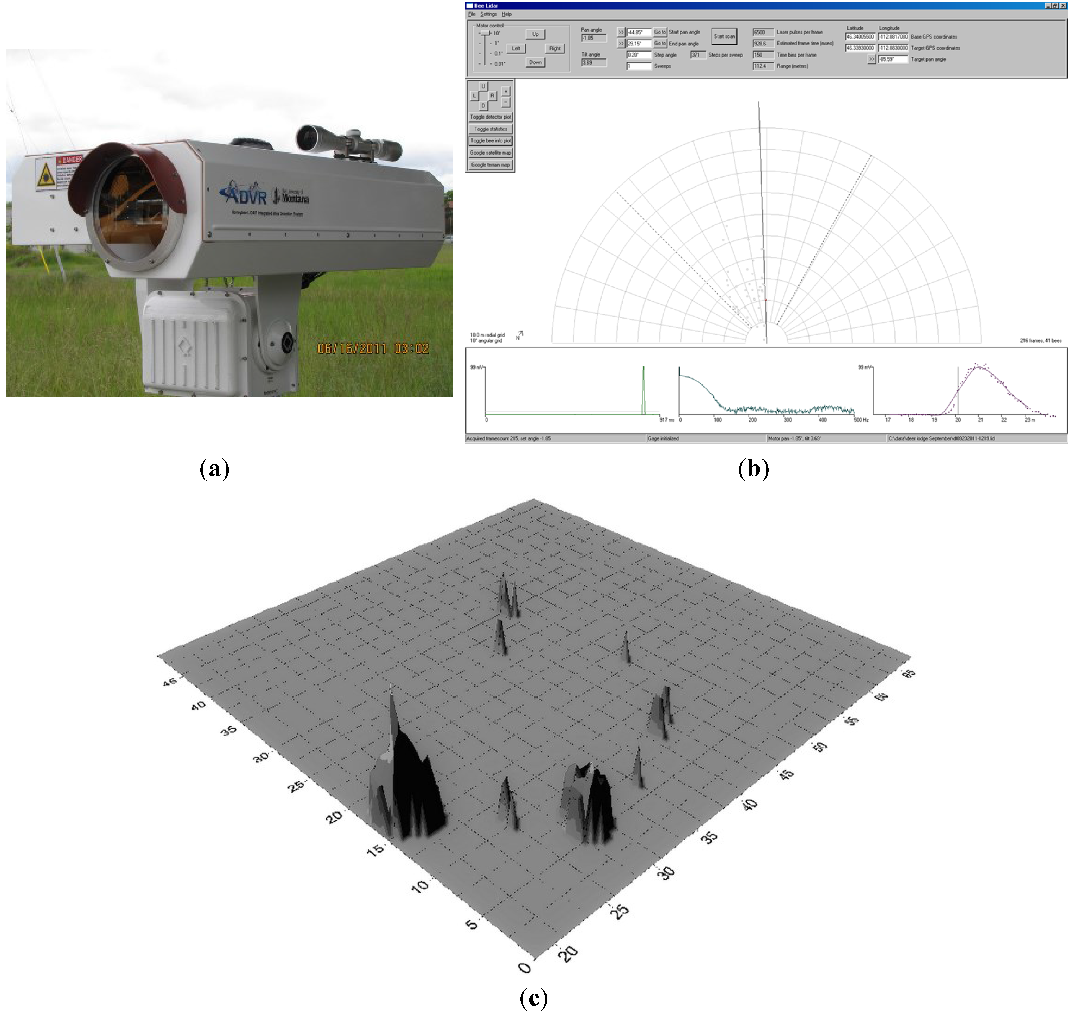 Having established that LIDAR could be used for locating, tracking, and mapping bees, our research team, representing UM, Montana State University (MSU), and Sandia Laboratory, obtained patents and published a series of studies to develop and use both visual monitoring and LIDAR to map bee locations [14,15,16,70,71,72,73]. The majority of the verification research was conducted using an Army test field in Missouri. The instruments used for these studies were mostly research prototypes.