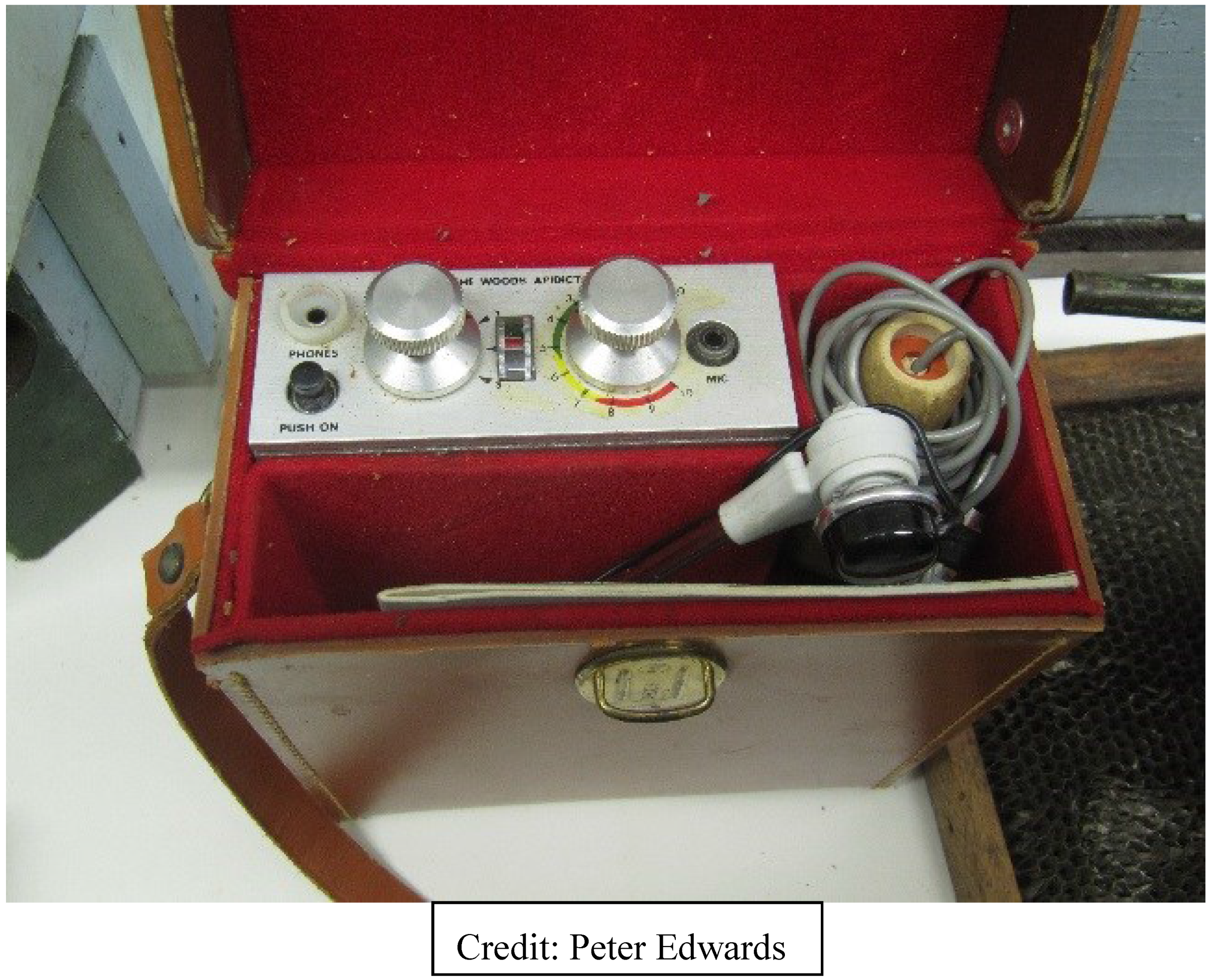The first marriage of electronic sensors and bees was a frequency analyzer called the Apidictor (Figure 3), developed, patented, and sold during the 1960s by a UK beekeeper and sound engineer, E.F. Woods [41]. The Apidictor was a frequency band-pass filter for detecting sound changes which occur in beehives up to two-to-three weeks before a bee colony swarmed. Work on a modern Apidictor has re-emerged in Europe, and Wood’s schematics are available on the Internet. There also is video of a 2012 iPhone-based Apidictor. In 2011, Bencsik et al. [42] described their swarm detector using accelerometers to analyze hive vibrations.