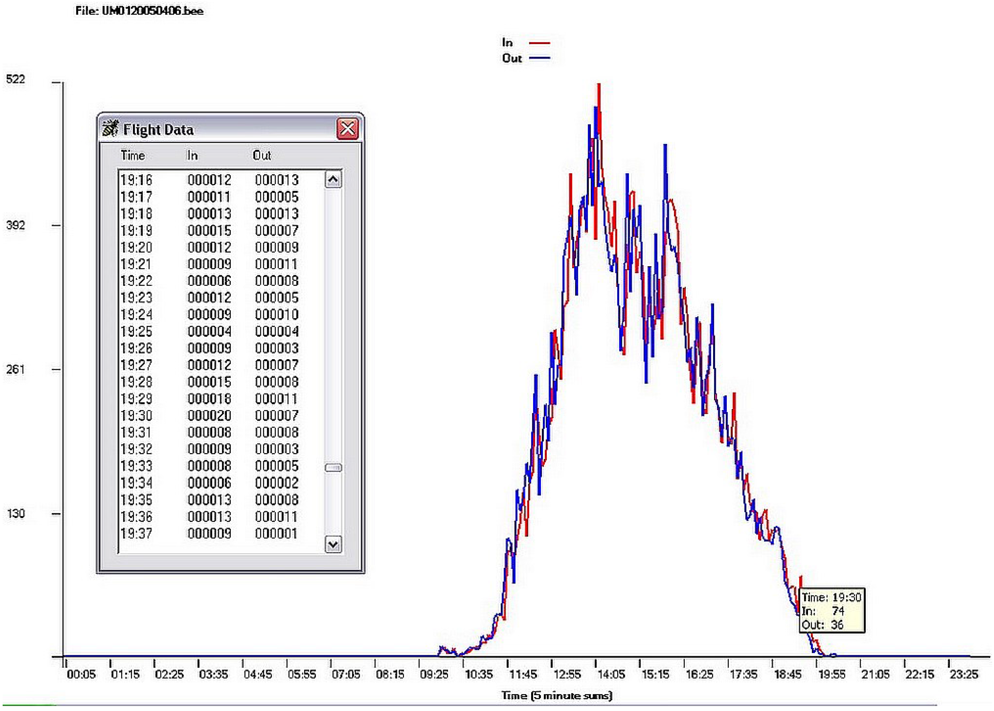 Screen captures of bee foraging data from bi-directional bee counters, 1995. The scrollable table and chart show a single colony’s daily forager activity (bee egress in red, bee ingress out blue) over 24 h. The data table can be accessed by tapping the activity plot at any point. A toggle brings up daily summaries for each colony by week.