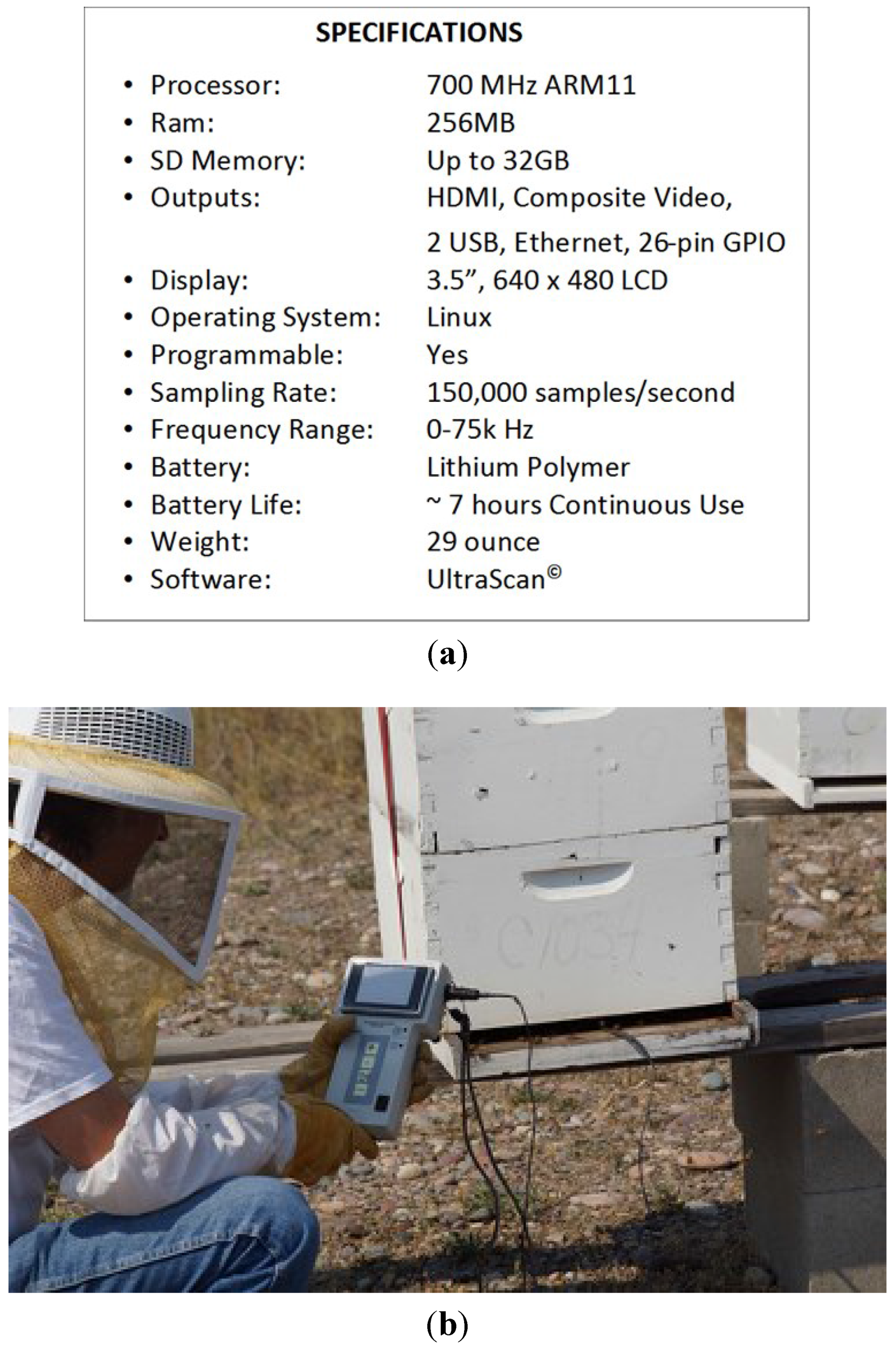 (a) Instrument specifications for hand-held acoustic scanner (HAS) for detection of bee pests, diseases, and exposures to harmful chemicals; Bee Alert Technology, Inc., (Missoula, Montana, USA); (b) HAS acoustic scanner. A probe microphone is slid into the colony entrance and a 60 s recording taken. The device reads out the detections and probability of detection (e.g., queenless, 95% probability; varroa mites, 28% probability; Africanized bees, 97%, and so forth).
