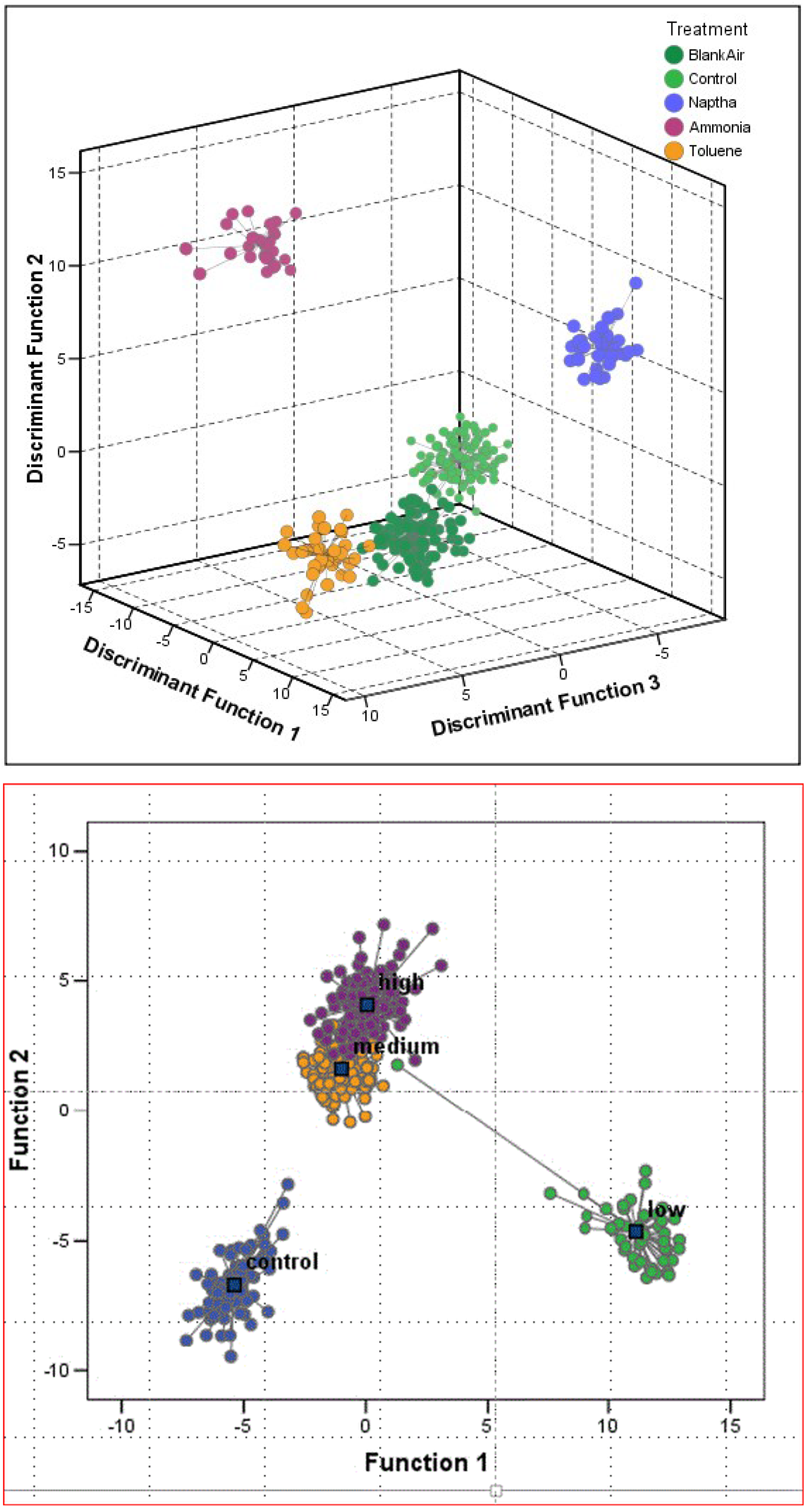 Recently, we have just completed another USDA SBIR I project focused on the detection of acute and chronic exposures of bee colonies to pesticides, especially the neonicotinoid pesticides. Preliminary data reveals that while honey bee colonies tend to become noisier when exposed to many of the older organic insecticides, colonies become quieter when exposed to neonicotinoids [96]. Our most significant finding across all of these studies is that not only are the sounds that bee colonies produce altered when the bees are exposed to different stressors, but the colony sounds change in ways which can delineate the type of chemical, pest, and disease (Figure 9a,b and Figure 10a,b) [94,95,96].