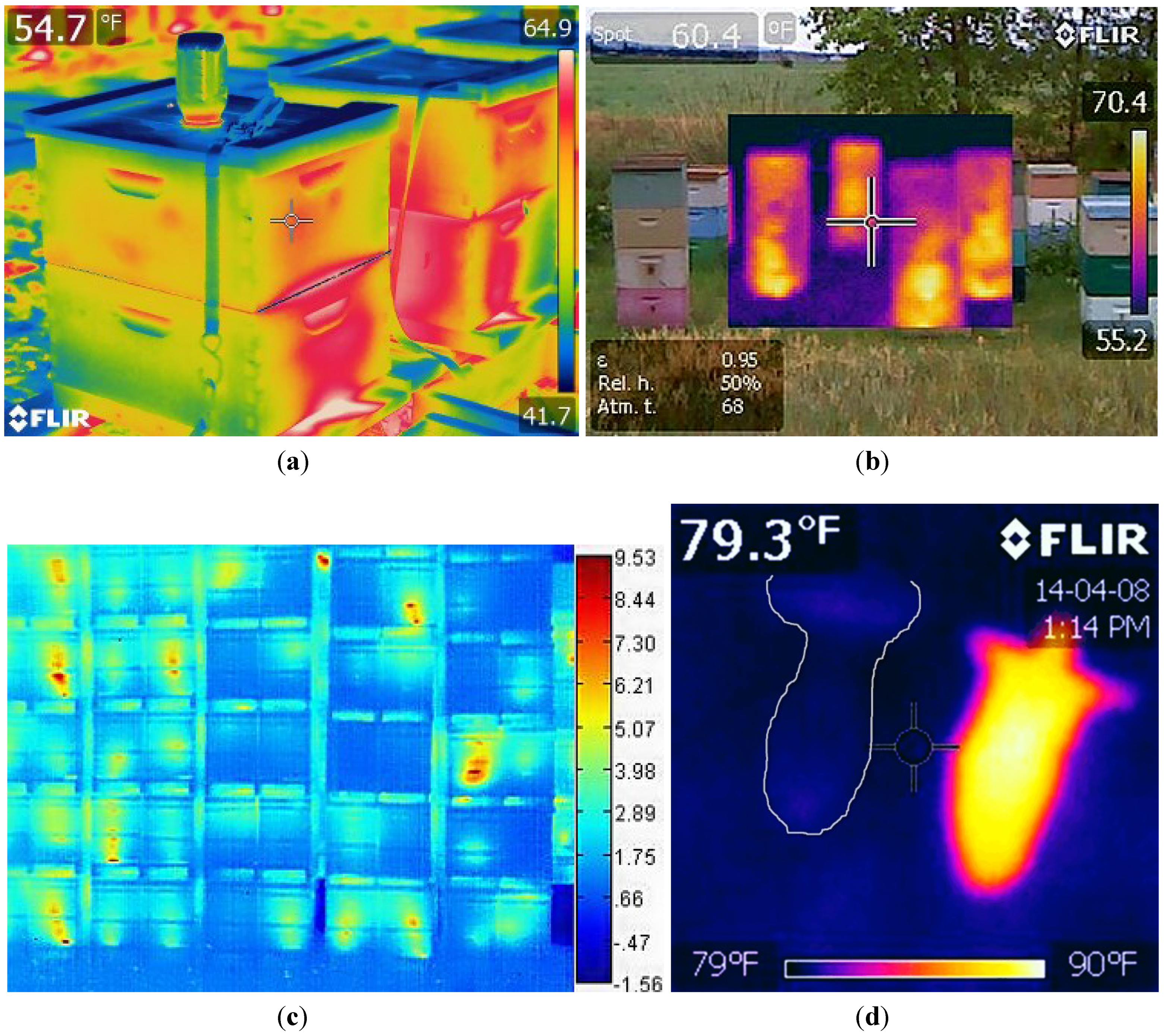 All objects and animals emit InfraRed (IR) radiation as a function of temperature. Kastberger and Stachel [100] (2003) provided a technical overview of IR measuring systems used with biological systems. They address, among other applications, the imaging of bees and wasps. In 2011, we and our collaborators from Montana State University (MSU) published an article on infrared imaging for non-invasive population assessments of honey bee colony populations in beehives [101]. Since then, we have been investigating other uses of IR cameras for bee management and experimenting with IR cameras of differing resolution capabilities (Figure 12a–d).