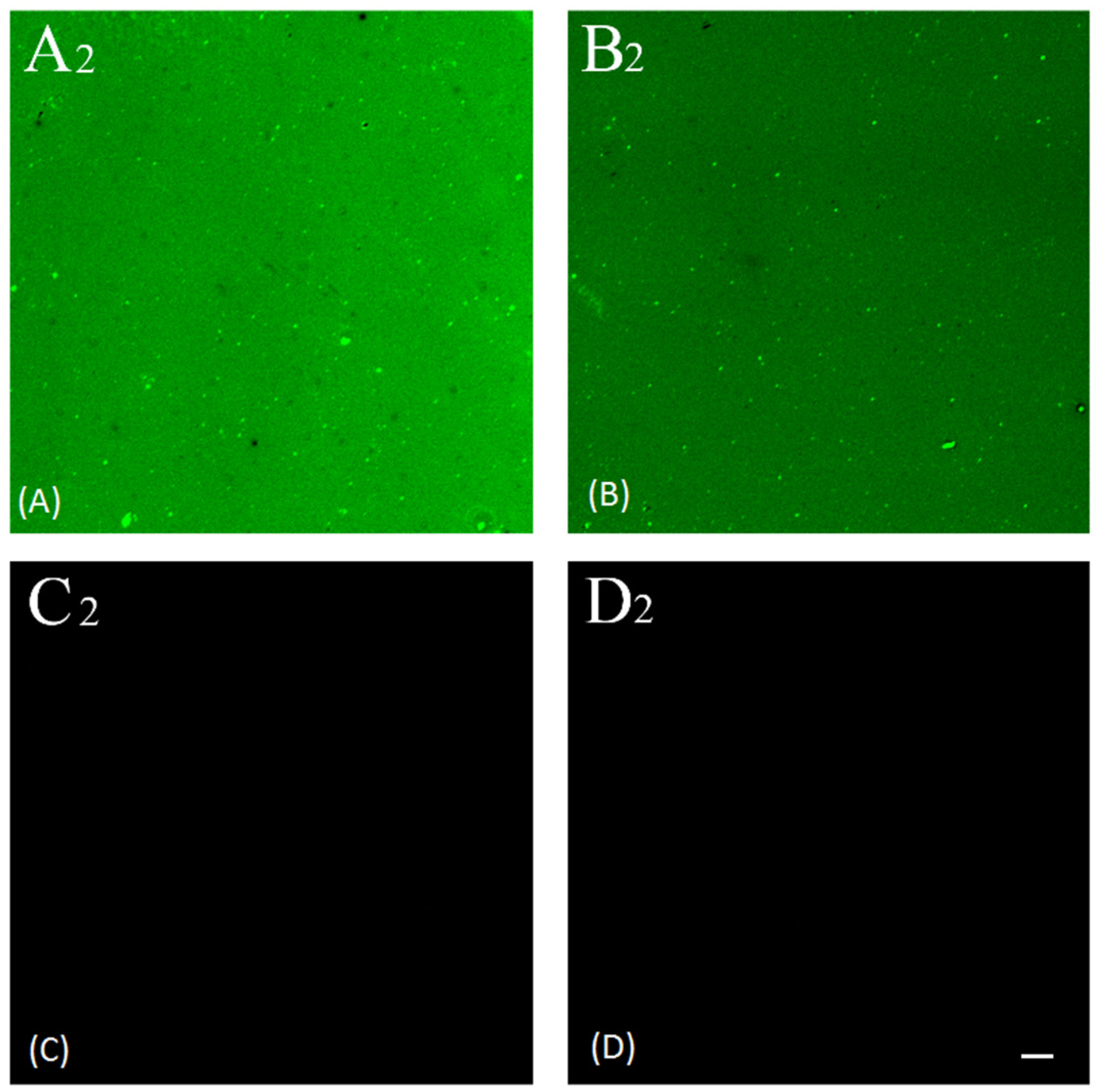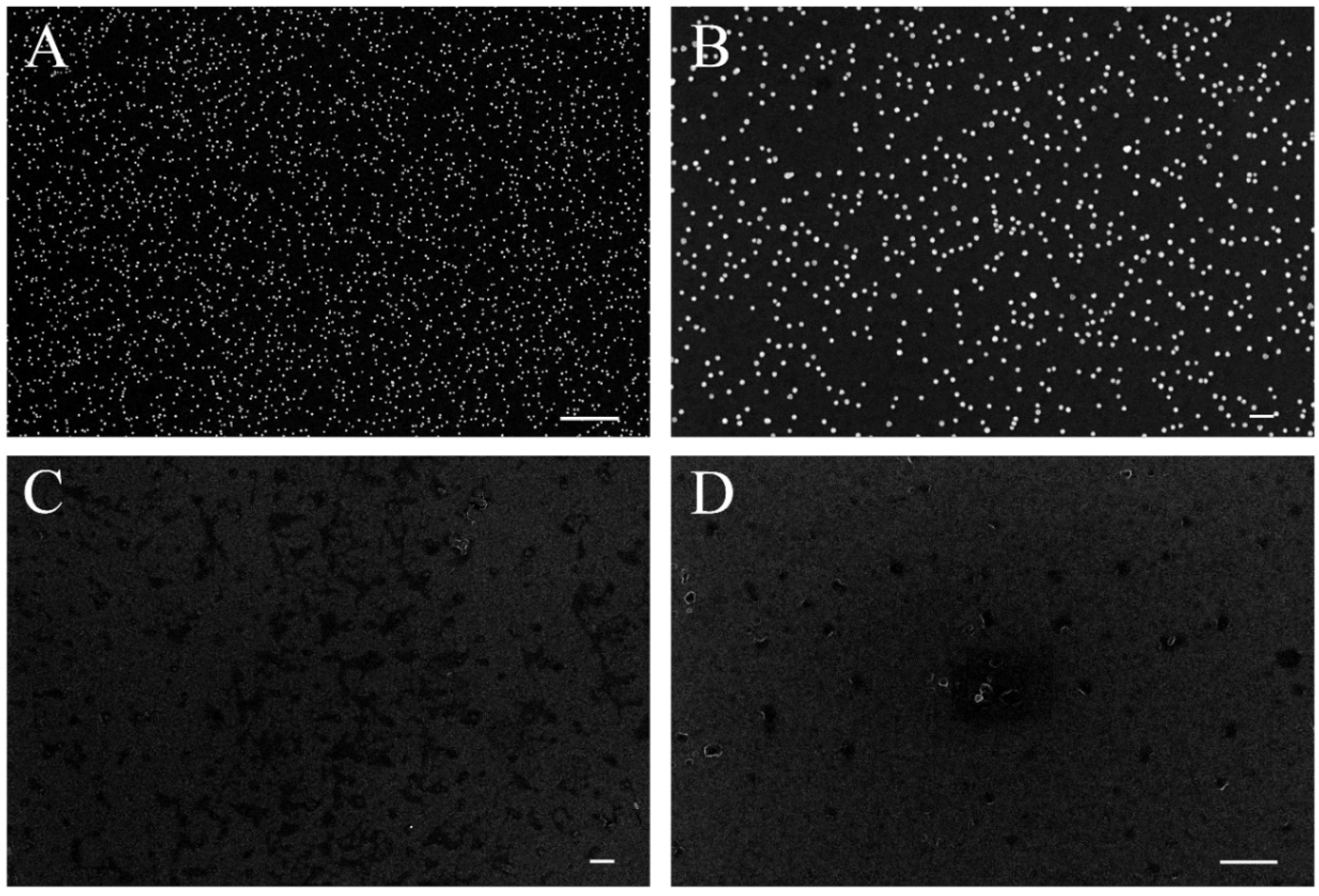 Comparison of presence of FITC on the surface of sample chip A2, B2 and control chip C2, D2: (A) FITC distribution on chip A2; (B) FITC distribution on chip B2; (C) FITC distribution on chip C2; (D) FITC distribution on chip D2. Scale bar stands for 2 μm.