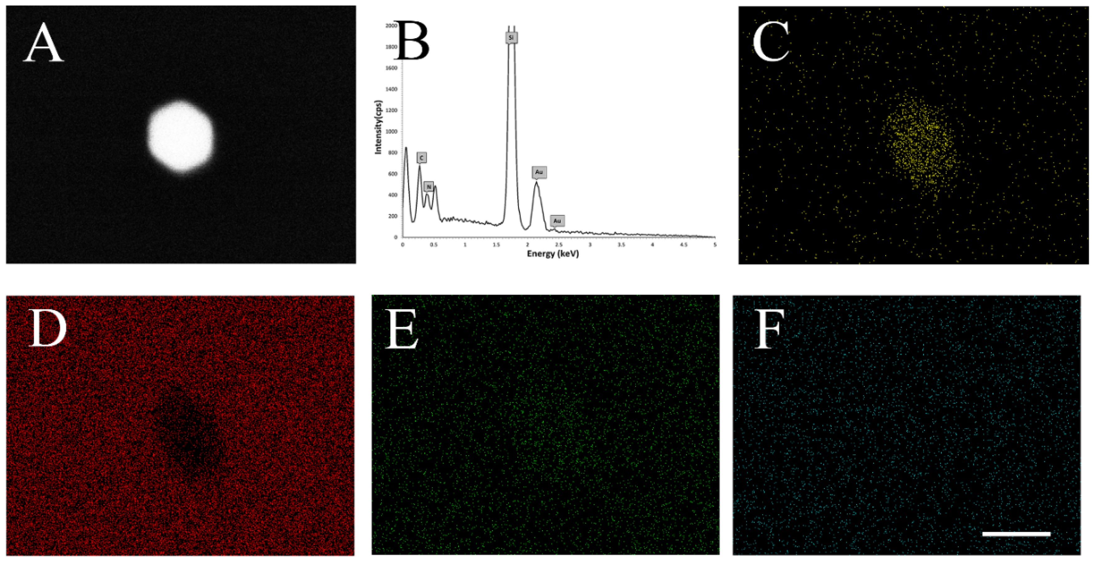 EDX analysis of substrate immobilized with AuNP: (A) SEM image of AuNP; (B) EDX spectrum of a point of the particle, showing peaks of gold, silicon, carbon and nitrogen; (C) EDX map of distribution and relative intensity of gold in scanned area; (D) EDX map of distribution and relative intensity of silicon in scanned area; (E) EDX map of distribution and relative intensity of carbon in scanned area; (F) EDX map of distribution and relative intensity of element nitrogen in scanned area. Scale bar stands for 50 nm.