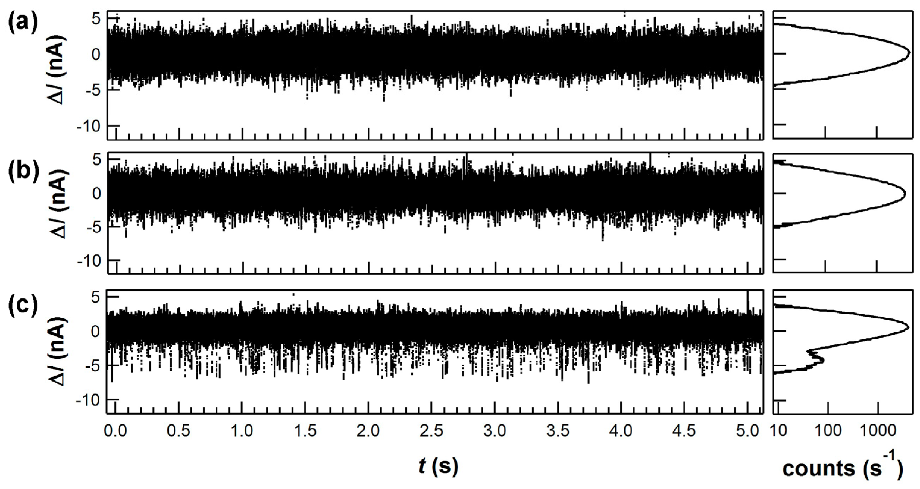 Finally, data analysis is an important part of the proper operation of these devices. One advantage of the SWNT-FET technique is its ability to continuously monitor the full reaction trajectory of a molecule over minutes, hours, or days. However, SWNT-FETs generate noise with a 1/f spectrum [67,68], meaning that long-duration measurements also exhibit large-magnitude baseline fluctuations. AC coupling or other highpass filtering successfully eliminates the lowest-frequency wanderings and emphasizes just the deviations ΔI(t) from the DC average. Figure 3a illustrates the typical noise levels after filtering, and it depicts the threshold level used to distinguish fluctuations that are attributable to KF with certainty. The filter cutoff must be chosen carefully to avoid biasing the analysis of protein activity. For example, substantial 1/f noise in the 0.1 to 10 Hz frequency band directly overlaps with the enzymatic activity of DNA polymerase, which has average turnover rates of 20 to 40 s−1 amid stochastic pauses lasting 1 s or more. The overlap of the desired signal with SWNT noise requires more sophisticated filtering techniques such as the open source analysis solutions vbFRET [69] and NoRSE [70] or, for the most challenging analyses, other nonlinear, machine learning techniques [71,72]. At present, reliable enumeration of enzyme information from long data records remains a challenging task that has only been partly automated.