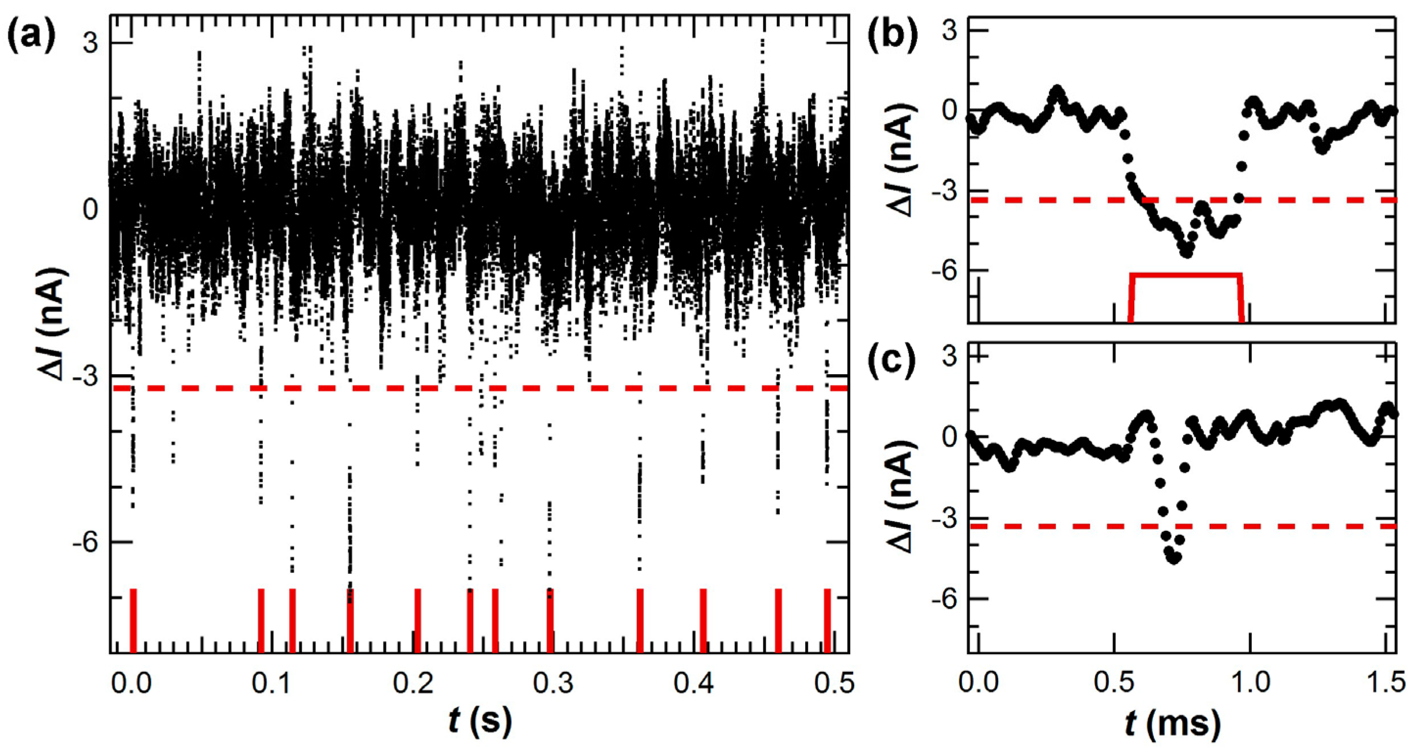 (a) ∆I(t) excursions and event enumeration (red) at higher magnification. Individual excursions were counted as dNTP incorporations if they exceeded a threshold determined by the baseline 1/f noise (dashed lines) and if their duration exceeded 100 μs (i.e., 10 data points). (b,c) Magnified plots of the first two ∆I(t) excursions in (a) demonstrate examples of: (b) a base incorporation event; and (c) an excursion rejected for having a short, unresolved duration. A 40 μs amplifier rise time limited analysis to the longer events, but better time resolution might reliably identify brief ∆I(t) excursions caused by noncatalytic KF motions.