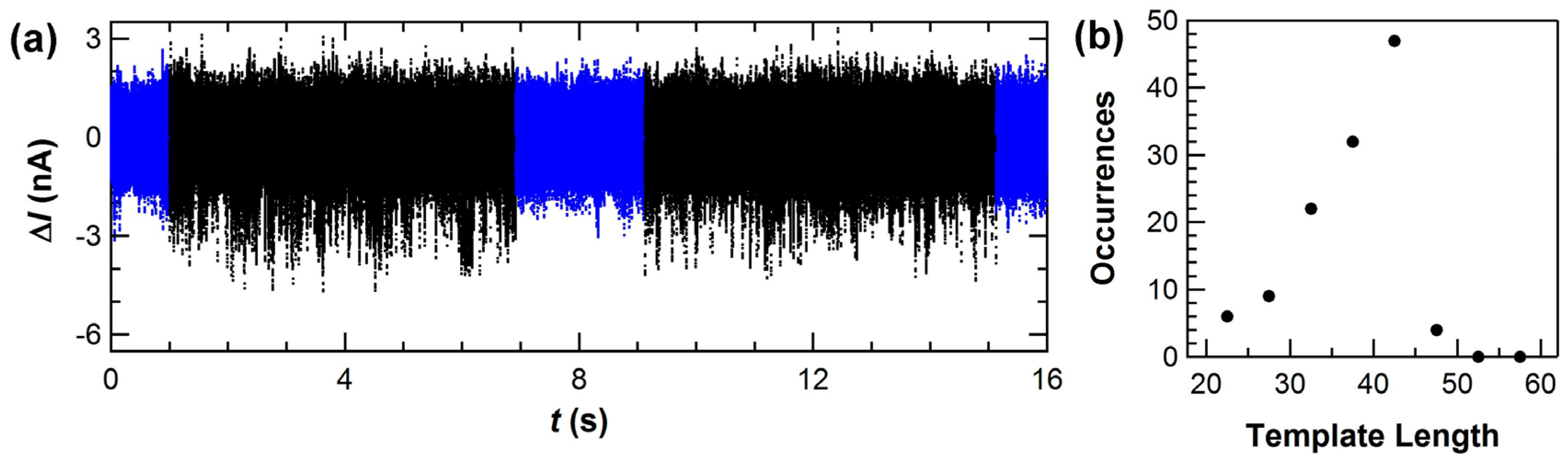 (a) Template concentrations below 5 nM introduced additional pauses (blue) in the records of KF activity. The pauses represent diffusional waiting times for template arrival and association. Each uninterrupted sequence of ∆I(t) excursions (black) represents the processing of one template strand. (b) Distribution of apparent lengths observed using a low concentration of the homopolymer (dC)42 template, as determined by counting the individual ∆I(t) excursions in a 10-min data set containing 135 uninterrupted sequences.