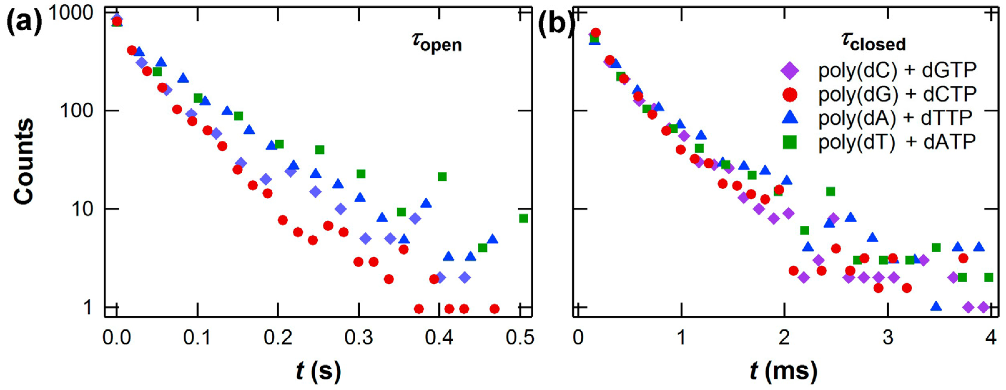 Example distributions of (a) τopen and (b) τclosed acquired for all four native nucleotides using a single KF molecule. The different slopes for τopen represent different average processing rates for the four nucleotides. The portion of the cycle represented by τclosed, in which catalytic incorporation of the nucleotide occurs, is insensitive to the nucleotide species. The exact value of <τopen> varies from one molecule to another and can be 50% to 300% of the values shown here. However, each different copy of KF follows the trends shown here.