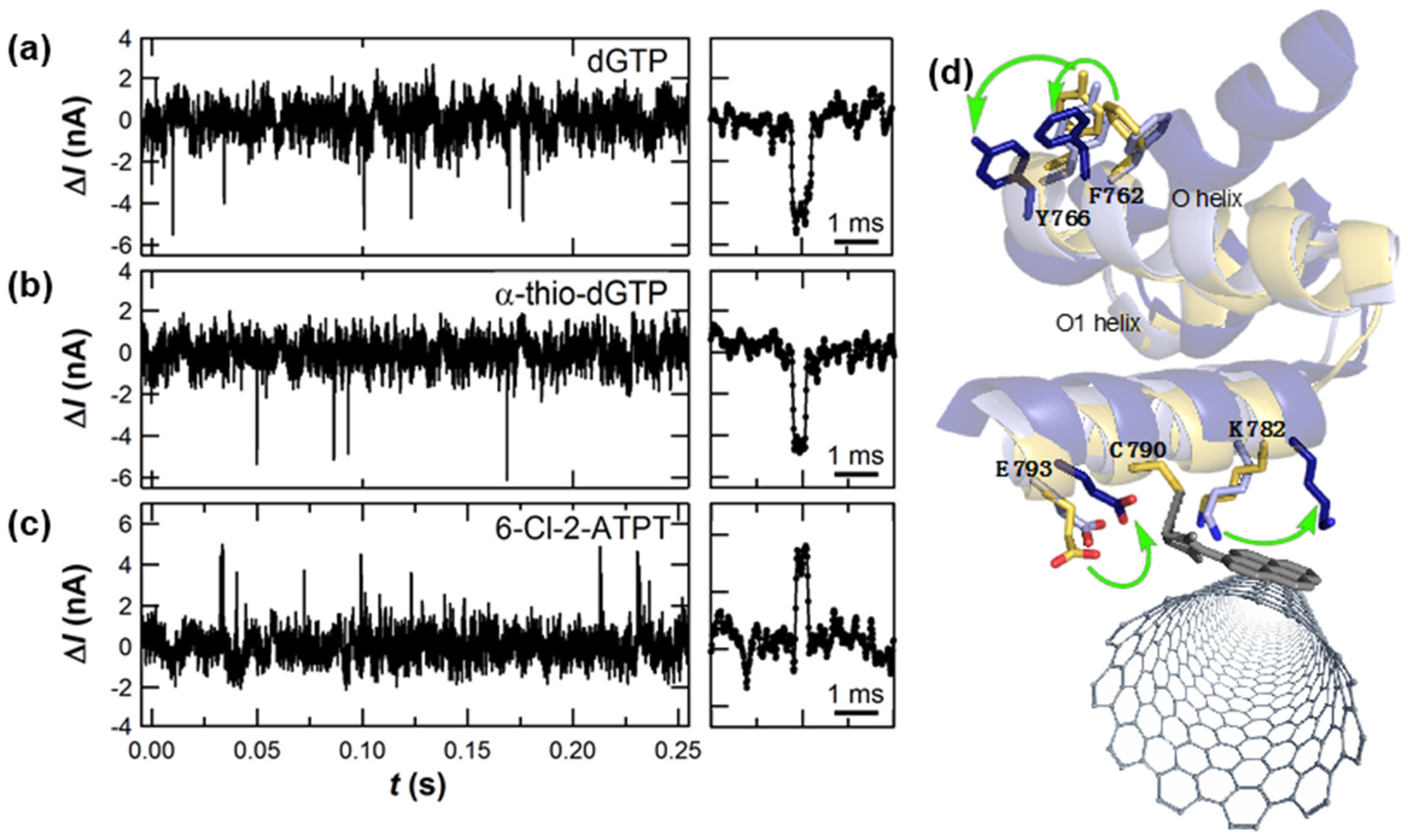 Direct comparison of nucleotide incorporation events into poly(dC)42 templates using: (a) native dGTPs; (b) α-thio-dGTP; and (c) 6-Cl-2-APTP. (d) Reversal of the excursion direction suggests that conformational accommodation of the latter analog is allosterically transmitted to the SWNT, perhaps through motions of the O-helix depicted here.