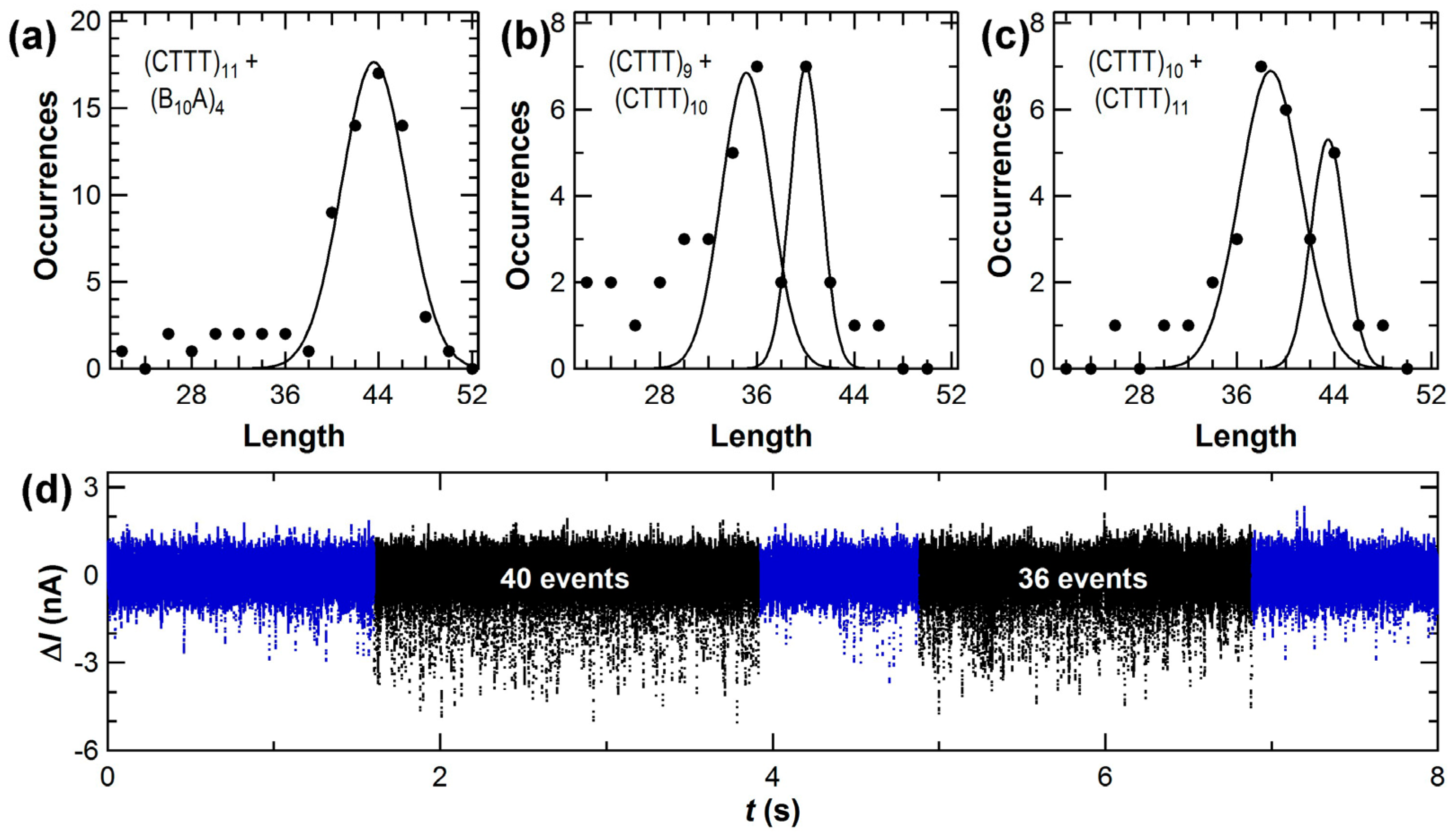 Base-enumeration distributions obtained from 0.5 nM concentrations of the templates: (a) (CTTT)11 and (B10A)4 measured separately; (b) (CTTT)9 mixed with (CTTT)10; and (c) (CTTT)10 mixed with (CTTT)11. Solid curves are Gaussian curve fits to each peak and fitting results are summarized in Table 2. Mixing two templates together led to fewer that 25 template molecules being counted in a typical data record, but the accuracy of peak fitting was not substantially reduced. (d) Example ΔI(t) record collected with the (CTTT)9 + (CTTT)10 mixture, illustrating a cluster of 40 dNTP incorporations, a 1-s pause, and a cluster of 36 incorporations.