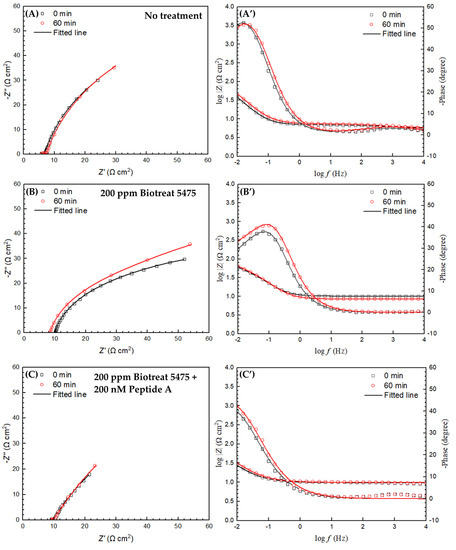 26Cr3Mo Nyquist (left) and Bode (right) plots after 1-h biocide treatment: (A,A’) no treatment, (B,B’) 200 ppm Biotreat 5475, (C,C’) 200 ppm Biotreat 5475 + 200 nM Peptide A, and (D,D’) 400 ppm Biotreat 5475. (Phase curves start from 0 degree).