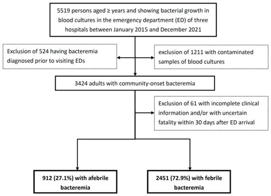 Bacteremia was defined as the presence of bacteria in blood cultures obtained via central or peripheral venipunctures after excluding contaminated samples. Blood cultures that contained potential contaminating microorganisms, such as Gram-positive bacilli, coagulase-negative Staphylococcus, Micrococcus species, Propionibacterium acnes, Peptostreptococcus species, and Bacillus species, were classified as contaminated []. Community-onset bacteremia referred to cases where the bacteremic episode originated in the community, including healthcare facilities not affiliated with hospitals []. A tympanic temperature below 38 °C (without the use of antipyretic agents) during the first 24 h after ED arrival was considered as indicative of an afebrile status, whereas a temperature measurement of 38 °C or higher was classified as febrile. Polymicrobial bacteremia was defined as the isolation of more than one microbial species from a single bacteremic episode, while monomicrobial bacteremia referred to the isolation of one or more microbial species from a single bacteremic episode.