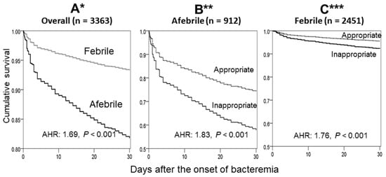Kaplan–Meier survival curves and Cox regression comparing 30-day mortality between individuals with afebrile and febrile bacteremia in overall patient sample (A) * and between individuals receiving inappropriate and appropriate empirical antibiotics among those with afebrile (B) ** or febrile (C) *** bacteremia. * Adjusted for 11 independent predictors of mortality in overall patient sample (Table 2): inappropriate empirical antimicrobial therapy; inadequate source control during antimicrobial therapy; comorbid malignancies; critical illness at ED; polymicrobial bacteremia; bacteremia due to lower respiratory tract infections, urinary tract infections, liver abscess, or infective endocarditis; primary bacteremia; and an etiologic pathogen of Pseudomonas species. ** Adjusted for four independent predictors of mortality in patients with afebrile bacteremia (Table 3): comorbid malignancies, critical illness at ED, and bacteremia due to urinary or biliary tract infections. *** Adjusted for eight independent predictors of mortality in patients experiencing febrile bacteremia (Table 4): inadequate source control during antimicrobial therapy; comorbid malignancies; critical illness at ED; polymicrobial bacteremia; bacteremia due to lower respiratory tract infections, urinary tract infections, or infective endocarditis; and an etiologic pathogen of Pseudomonas species.