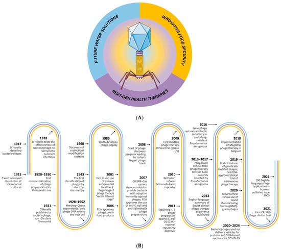 Graphical overview of promising applications of phages (A) and timeline of major phage events (B).