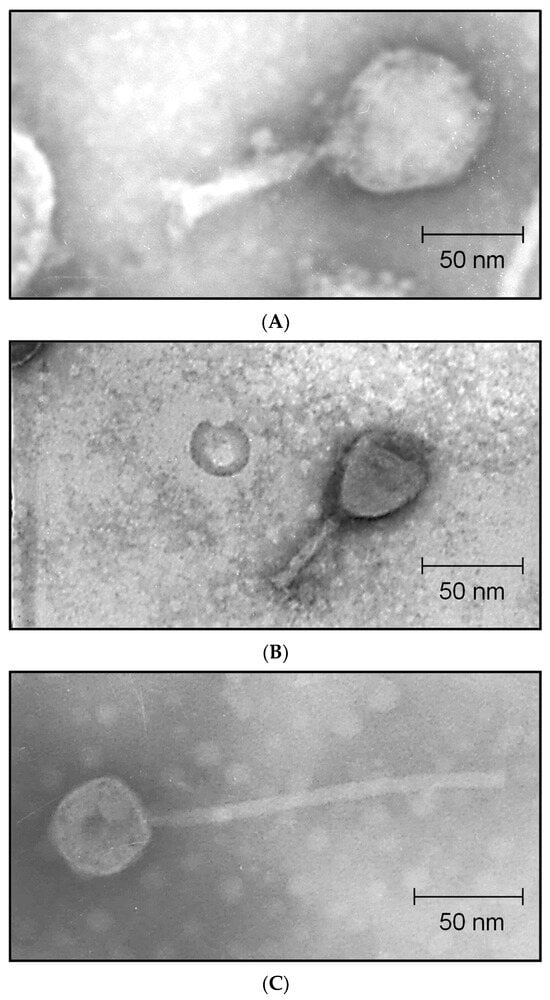 Some transmission electron microscopy images of Escherichia coli (A,C) and Enterobacter (B) phages. The phage in (A,B) exhibited a contractile tail (42 ± 3 nm, 50 ± 2 nm) and an icosahedral head (82 ± 2 nm, 65 ± 2 nm), respectively, a morphology characteristic of the former Myoviridae family. The phage in (C) is characterized by a circular head (69 ± 6 nm) and a long, non-contractile tail (217 ± 8 nm), a morphology characteristic of the former Siphoviridae family. All images presented in this figure were acquired by the authors.
