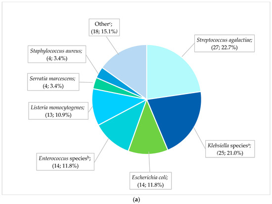 The most frequent pathogens (n = 119) cultured from neonates with EO-BSIs were S. agalactiae (27; 22.7%), Klebsiella species (25; 21.0%), and E. coli (14; 11.8%) (Figure 2a). All cases of S. agalactiae and Listeria monocytogenes were sensitive to the first-line antibiotic regimen of ampicillin plus gentamicin. In contrast, Gram-negative pathogens exhibited substantial antibiotic resistance: 70.8% (17/24) of EO-BSI K. pneumoniae isolates were extended-spectrum β-lactamase (ESBL) producers, and 12.5% (3/24) were carbapenem-resistant. K. pneumoniae infections occurred predominantly in extremely low-birth-weight neonates (41.7% [10/24] <1 kg, and 66.7% [16/24] with a gestational age of less than 32 weeks). Most K. pneumoniae EO-BSIs occurred on day 2 or 3 of life (17/24; 70.8%).