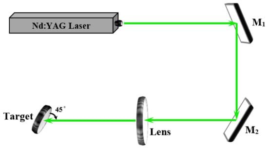 To minimize the amount of energy lost due to carrier or thermal diffusion during absorption, short laser pulses with a wavelength strongly absorbed by the material are recommended. To avoid overlapping between the laser beam and the plume, the beam was irradiated onto the target at an incident angle of 45° as shown in Figure 1. The ability of lasers to operate in the Q-switch mode (laser ability to produce a pulsed output beam) enabled the femtosecond, excimer (XeCl 308 nm, KrF 248 nm and ArF 193 nm), ruby (694 nm) and Nd:YAG (1064 mm, 532 nm, 355 nm and 266 nm) to deposit an efficient amount of energy into a thin layer of the target.