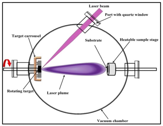 Compared to other PVD techniques such as MBE, EBPVD, arc discharge, ion beam sputtering and reactive sputtering and chemical vapor deposition (CVD) techniques, the PLD technique has shown some outstanding advantages. In CVD, precursors are used as the starting material, while in PLD solid targets are deposited on a substrate using laser ablation. In PLD, the rate of the film growth can be controlled by changing background gas, adjusting the laser parameters, deposition time and substrate to target distance []. Some of the major advantages of PLD over other PVD techniques are the transfer of the stoichiometry of the target material deposited on the substrate, deposition at high temperature and high deposition rate [,]. Another advantage of PLD is that a very short time frame is required for deposition.