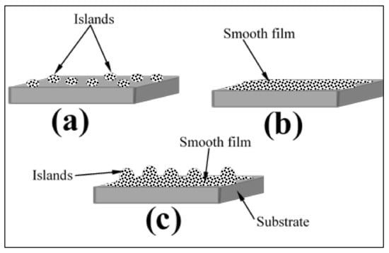 Layer plus island or the Stranski–Krastanov mode: layer plus the island growth mode occurs when islands are formed after the formation of one or two monolayers on the surface of the substrate (Figure 3c) [].