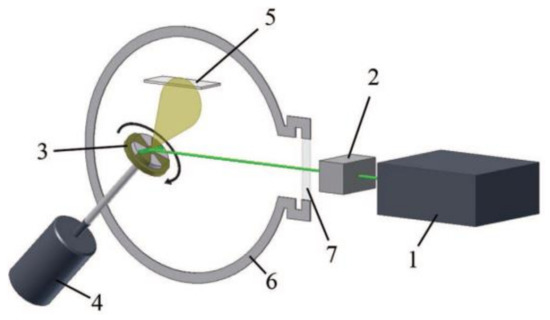 Schematic illustration of the set-up of the scanning multi-component pulsed laser deposition (1: laser, 2: scanner, 3: segmented target, 4: motor, 5: substrate, 6: vacuum chamber and 7: optical window). Printed from [] with permission.