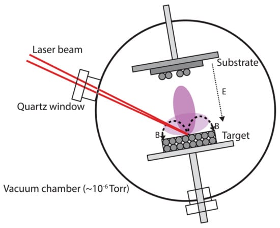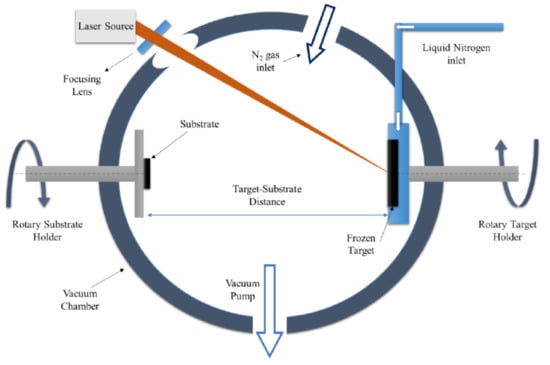 Laser ablation has been analyzed using different models, namely mechanical, photochemical, thermal, photophysical and the defect model. In these models, ablation was treated as the dominant mechanism. The ablation process starts with a single or multi-phonon excitation in the target material. The optical properties of the material are changed with an increasing temperature by the instantaneous conversion of the excitation energy into heat. Thermal ablation occurs when the temperature at the surface of the target material is increased, without the surface melting []. The ablation threshold ranges between 0.1 and 1 J/cm2 depending on the target material and the laser wavelength []. The ionization of the target material induces plasma (plume) formation immediately when the ablation threshold of the material is reached. The plume with stoichiometry similar to that of the target material is collected on a substrate placed at a relatively short distance from the target (Figure 2).