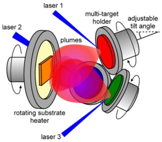 Multi-beam PLD involves a simultaneous deposition of a thin film from a multitarget of dissimilar material by mixing of more than one plume. This is usually achieved by the ablation of different targets with a different laser beam [,]. A schematic showing a typical multitarget PLD experimental set-up is presented in Figure 7. It is comprised of three rotatable targets, which can be ablated using three different lasers []. The targets also have a programmable tilt capability and adjustable distance from the substrate. The plumes generated by the three lasers can be time-delayed or synchronous, which gives room to control the respective contribution of each target by either adjusting the laser repetition rate or by blocking the laser beam from reaching a given target using a computer automated shutter.