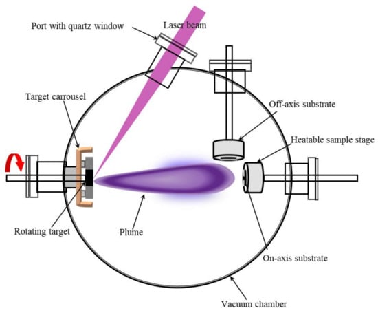 Off-axis PLD arrangement involves placement of the substrate perpendicular to the target (Figure 8), in contrast to the on-axis arrangement (used in the conventional PLD) where the substrate is placed in the opposite direction to the target []. Thin films deposited using the off-axis technique have shown superior qualities such as about seven times thinner, 15 nm compared to 100 nm obtained from the film deposited using on-axis setup [] and uniform films with a larger film area, up to 2 inches (~5 cm) in diameter [].