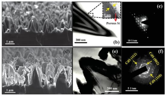 The field emission scanning electron microscope (FESEM) cross-section image of the bSi fabricated on a Si substrate reported by Sarkar et al. [] is shown in Figure 9a. The FESEM micrograph revealed that the bSi formed vertical cone-shaped nanostructures of the diameter between 500 and 700 nm, height between 1 and 3 µM and tips of a few nanometers in diameter. The transmission electron microscope (TEM; Figure 9b) of the cross-section of the Si nanostructure revealed the nanocones shape. The porous structure of the Si nanocones at the surface of the cone resulting from the chemical etching is shown in the inset of Figure 9b. The selective area electron diffraction (SAED) pattern (Figure 9c) confirmed that the core of the nanocones were crystalline despite the pore (2–5 nm) observed at the outer shell. The cross-section of the FESEM image of the CdS thin film laser ablated on a bSi nanocones is shown in Figure 9d. The FESEM micrograph confirmed a uniform coverage of CdS thin film with thickness between 50 and 80 nm on the surface of the bSi nanocones. The thickness of some thin films recently deposited using PLD is summarized in Table 1. The uniformity of the CdS layer on the surface of the nanocones is further confirmed by the FESEM image shown in Figure 9e. As shown in Figure 9f, the SAED pattern of the CdS/bSi heterojunction shows the diffraction rings confirming the polycrystalline nature of the CdS thin film. The SAED pattern also revealed the (002), (110) and (112) planes of wurtzite CdS [].