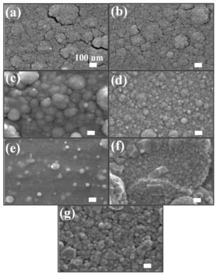 Figure 10 shows the FESEM images of Ga2O3 thin films we reported in our recent work []. The films were deposited at different substrate temperatures (room temperature, 100, 200, 300, 400, 500 and 600 °C) and the images are shown in Figure 10a–g respectively. We observed that the morphology of the particles was temperature dependent, with the films deposited at lower temperatures comprising of an agglomeration of spherically shaped nanoparticles while the films deposited at a higher substrate temperature were composed mainly of cubic shaped nanoparticles. The formation of nanocubes is due to preferential crystal plane orientation over others during the growth of the films [,]. These variations in the particle morphologies resulted in a significant variation of the shapes of the photoluminescence (PL) spectra depicted in the 13th figure.