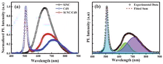 Figure 11a shows the normalized PL spectra of the bSi, a control CdS thin film and the CdS/bSi heterojunction excited at the wavelength of 325 nm []. The PL spectrum of the bSi exhibited a broad band with a maxima around 644 nm assigned to the quantum confinement of the charge carriers present in Si nanocrystals formed on the porous surface area of the bSi nanocones [,,,]. The control CdS thin film showed a sharp peak around 512 nm assigned to the near band edge (NBE) emission from CdS [,] and the broad band with maxima at 714 nm, which is assigned to the transition of trapped electrons from Cd vacancies to the CdS valence band [,,]. The emission spectra from the CdS/bSi nanocones heterojunction comprises of bands from both Si nanocones and CdS thin film. The deconvoluted PL spectrum of the CdS/bSi heterojunction shows three peaks with maxima at 512, 644 and 714 nm as shown in Figure 11b, which are in agreement with the peak positions of the individual peaks obtained from the PL spectra of Si nanocones and CdS films depicted in Figure 11a.