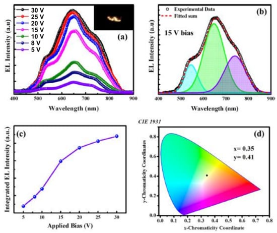 The EL emission spectra of the n-CdS/p ± bSi heterojunction at different forward bias voltage (5–30 V) are depicted in Figure 12a []. The EL spectra exhibit broad bands covering almost the entire visible wavelengths and some part of the near-infrared (NIR) region. The inset of Figure 12a is the digital image of the EL emission of the device when a forward bias voltage of 15 V was applied. The deconvoluted EL emission spectra of the n-CdS/p ± bSi heterojunction when applying a 10 V bias (Figure 12b) exhibited three bands with a maxima at 530, 652 and 735 nm, which were in good agreement with the deconvoluted PL emission spectrum shown in Figure 11b. The integrated EL intensity of the fabricated n-CdS/p ± bSi heterojunction (Figure 12c) showed almost a linear behavior with increasing bias voltage from 5 to 15 V and later showed a saturation tendency. The Commission Internationale de I’Eclairage (CIE) chromaticity coordinate of the n-CdS/p ± bSi heterojunction calculated from the EL data obtained when 15 V bias was applied is shown in Figure 12d. The chromaticity coordinates of x = 0.35 and y = 0.41 suggests a yellowish white emission.