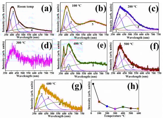 Figure 13 shows the PL emission spectra associated with the Ga2O3 films whose FESEM images are presented in Figure 10. The spectra were recorded when the films where excited using a 325 nm He-Cd laser. The PL emission spectra in Figure 13a–g are of the Ga2O3 thin films deposited at different substrate temperatures, namely room temperature, 100, 200, 300, 400, 500 and 600 °C, respectively, as reported by Ogugua et al. []. The PL emission spectra showed temperature dependent behavior (like the FESEM micrographs (see Figure 10)) with peaks in the UV, blue, green and red region of the spectrum. The positions of the fitted PL peaks observed at the different substrate temperatures are shown in Table 2. These emission peaks were ascribed to the self-trapped excitons [], defect donor recombination levels created by oxygen vacancies and the hole in the acceptor level formed by gallium vacancies or gallium-oxygen vacancy pair [,] and the presence of impurities such as Li, Zr, Be, Ge, Si and Sn [], respectively. Figure 13h shows the behavior of the PL emission intensities of the films as a function of substrate temperature.