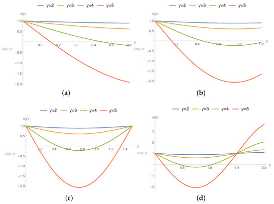 Values of u in varying domain values of y at different values of : (a) = 0, (b) = 1, (c) = 2, (d) = 3, (e) = 4, and (f) = 5.