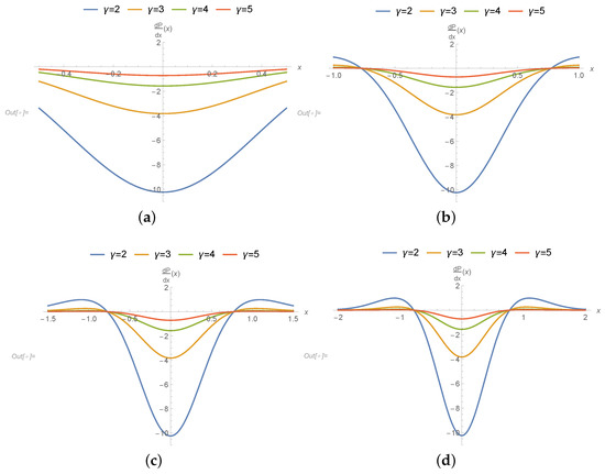 Values of in varying domain values of y at different values of : (a) = 0, (b) = 1, (c) = 2, (d) = 3, (e) = 4, and (f) = 5.
