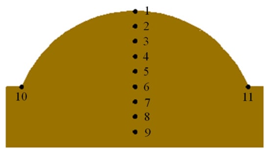 In order to work out the optimal experimental parameters and analyze the thermal stress cycle of the cladding layer, probes were added to 11 sample points in the cladding layer to record the changes of temperature and thermal stress in real time. Figure 3 shows the locations of the sample points. The cross section is selected in the middle part with stable cladding to ensure the representativeness and accuracy of sample points, avoiding excessive errors as well.