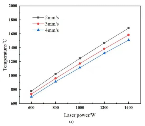 The main parameters of laser cladding include laser power, scanning speed, spot diameter, and powder feeding rate, among which the spot diameter and powder feeding rate mainly affect the height and width of cladding layer, but have little influence on the temperature field distribution. Through simulation calculation, it is found that the temperature field cloud map of different spot diameters and powder feeding rates is basically the same, which is not necessary to be analyzed, but mainly to analyze the influence of laser power and scanning speed on the laser cladding temperature field. The simulation was carried out by changing the laser power and scanning speed. The laser power was 600 W, 800 W, 1000 W, 1200 W, and 1400 W, the scanning speed was 2 mm/s, 3 mm/s, and 4 mm/s.