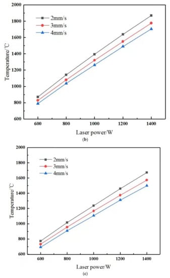 Maximum temperature variation with power of horizontal sample points at different scanning speed. (a) Sample point 10, (b) Sample point 6, (c) Sample point 11.