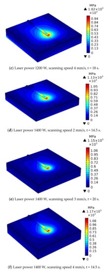 Thermal stress is the main reason for cracks in the process of laser cladding, both laser power and scanning speed will affect the thermal stress value of the cladding layer. In order to further determine the numerical simulation parameter scheme, the thermal stress cloud images of the same position under six schemes are obtained through simulation (shown in Figure 6). The maximum thermal stress of the six schemes is listed in Table 3, it can be clearly observed that when the laser power is 1200 W and the scanning speed is 2 mm/s, the corresponding thermal stress value is the minimum. Therefore, this scheme is proposed as a numerical simulation scheme to study the thermal stress cycle.
