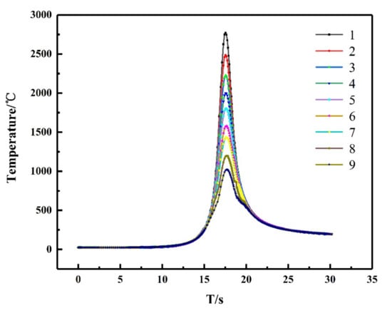 Taking the optimal simulation scheme, the thermal stress and thermal cycle curves are drawn and analyzed as shown in Figure 7. In the figure, the sample points are heated rapidly by laser at 16 s and reach the maximum temperature at 17.5 s. In the vertical direction, the maximum temperature of all points decreases with the increase of the cladding layer depth. The melting point of powder is 1450 °C, while the highest temperature of sample points 1–5 is higher than the melting point of powder, so the powder can be completely melted. The melting point of the substrate is 1300 °C, while the maximum temperature of sample points 6 and 7 is higher than that of the substrate. The maximum temperature of sample point 8 is 1180 °C. Therefore, the junction between the cladding layer and the substrate is located between sample points 7 and 8, sample points 8~9 are the heat-affected zone of the cladding layer. The spacing between sample points is 0.2 mm, the depth of the molten pool is approximately 0.2~0.4 mm.