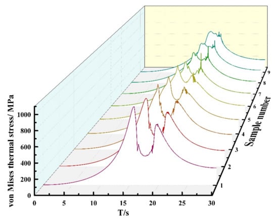 Figure 8 shows the von mises thermal stress cycle, thermal stress cycle curves of most sample points have two peaks. When the laser beam is close to the sample point, the thermal expansion of the material around the molten pool exerts pressure on the sample point, so that the first peak of thermal stress occurs at the sample point, at which point the thermal stress of most sample points reaches its maximum value. When the laser beam is located directly above the sample point, the material at the sample point is melted, and the stress at the sample point rapidly decreases to the bottom of the valley. When the laser beam is far away from the sample point, the molten pool starts to solidify as the temperature drops and the stress increases gradually, then the second thermal stress peak appears at the sample point. As the temperature gradually decreases to room temperature, the thermal stress gradually decreases and finally tends to a stable value, namely the residual stress of the sample point.