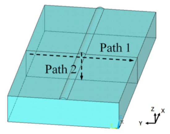 In order to study the residual stress distribution at different positions of the formed part, the middle position of the cladding layer was selected and cut along the plane. The junction between the cladding layer and the matrix along the axis is selected as the path1, and the path from the apex of the cladding layer to the vertical direction of the matrix along the axis is selected as the path2 to study the distribution of residual stress at different positions, as is shown in Figure 9.