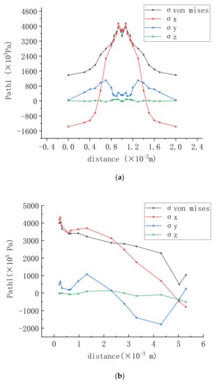 Residual stress distribution in two paths. (a) Residual stress distribution in path 1. (b) Residual stress distribution in path 2.