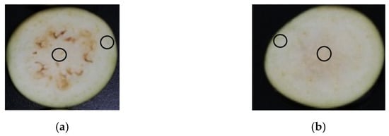 The color of the cut surface was determined using a CR400/CR410 colorimeter (Minolta, Tokyo, Japan). The center and edge of the fresh-cut eggplant pieces were selected as the detecting locations. The two types of samples, with and without seed, were selected as the detection samples (Figure 1). The color parameters (L*, a*, and b*) were determined. L*, a*, and b* indicate, respectively, lightness, red chromaticity, and yellow chromaticity. The decrease in L* indicated an enhancement in the degree of discoloration due to browning. Each test was performed on three different points for each sample. The BI was calculated using the following Equation (1) []: