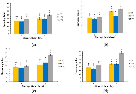 The effect of different temperatures (4, 16, 25 °C) on browning index of fresh-cut eggplant. (a) center with seed; (b) border with seed; (c) center without seed; (d) border without seed. Means designated by the same letters (uppercase, among different treatments at the same time point; lowercase, among different storage times at the same treatment) are significantly difference according to Duncan’s test. Bars represent means ± SD (n = 3, p < 0.05).