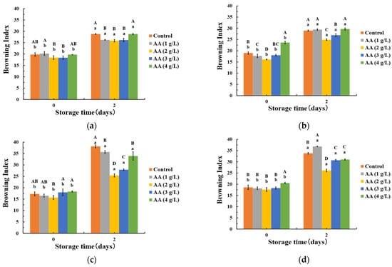 The effect of different concentration of ascorbic acid (AA) on browning index of fresh-cut eggplant. (a) center with seed; (b) border with seed; (c) center without seed; (d) border without seed. Means designated by the same letters (uppercase, among different treatments at the same time point; lowercase, among different storage times at the same treatment) are significantly difference according to Duncan’s test. Bars represent means ± SD (n = 3, p < 0.05).