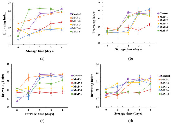 The effect of different ratio of modified atmosphere packaging (MAP) on browning index of fresh-cut eggplant. (a) center with seed; (b) border with seed; (c) center without seed; (d) border without seed. MAP-1, O2: 80 Kpa + CO2: 0 Kpa; MAP-2, O2: 5 Kpa + CO2: 15 Kpa; MAP-3, O2: 10 Kpa + CO2: 10 Kpa; MAP-4, O2: 15 Kpa + CO2: 5 Kpa; MAP-5, O2: 0 Kpa + CO2: 80 Kpa. Bars represent means ± SD (n = 3, p < 0.05).