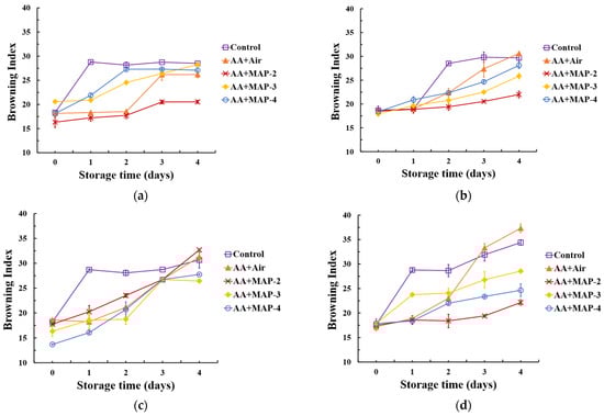 Figure 4 presents the changes in the BI of fresh-cut eggplants with MAP-1, MAP-2, MAP-3, MAP-4, and MAP-5. The BI at the center of the fresh-cut eggplant samples with seeds presented an increasing trend for control, MAP-1, and MAP-5 during four days (p < 0.05) (Figure 4a). It was obvious that the BI of the center with seeds in MAP-5 was the highest than that in other MAP ratios during 1–3 days. There is no significant different for BI between MAP-1 and MAP-5 at the 4th day. This might be due to the fact that MAP-5 with a high concentration of CO2 enhanced the anaerobic respiration of the fresh-cut eggplant and rapidly accelerated the browning rate. This demonstrates that the BI at the center of the fresh-cut eggplant with seeds in MAP-3 and MAP-4 was lower than that for the other treatments at the 4th day. At the border of the fresh-cut eggplant sample with seeds (Figure 4b), the BI value remained stable for 1 day. The browning of the border of the fresh-cut eggplant sample with seeds in the control, MAP-1, and MAP-5 significantly increased after 2 days and that in MAP-3 and MAP-4 after 3 days (p < 0.05). In comparison to the other MAP treatments, the MAP-2 sample presented a lower BI value at the 4th day. On the other hand, the BI changes at the center and border of the fresh-cut eggplant without seeds are presented in Figure 4c,d. It is obvious that the BI value of the center of the fresh-cut eggplant sample without seeds was higher in the control, MAP-1, MAP-4, and MAP-5 than that in the other treatment at the 4th day (p < 0.05). The BI value was lower in MAP-2 than that in MAP-3 for BI value after two days (p < 0.05) (Figure 4c). There is no significant difference for the BI of fresh-cut eggplant in MAP-2, MAP-3, and MAP-5 (p > 0.05) (Figure 4d). Therefore, the MAP-2, MAP-3, and MAP-4 treatments were chosen to be combined with AA of 2 g/L considering the negative effect of the high oxygen (MAP-1) and high carbon dioxide (MAP-5) on the browning of fresh-cut eggplant.