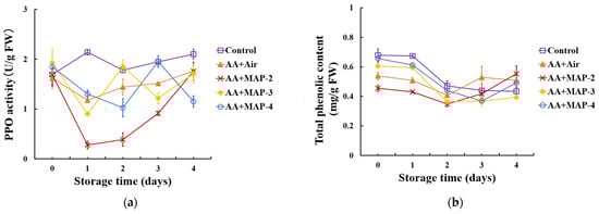 As shown in Figure 6a, lower PPO activities are obtained by the combination of AA and MAP-2, and the decrease in PPO activities is higher than that for other treatments after the beginning of storage (p < 0.05). The correlation between phenolic compounds and storage times is presented in Figure 6b. The total phenolic content shows the trend decreasing and increasing in the AA combined with MAP-2 during storage times (p < 0.05). The result indicates that the phenolic content correlates with the PPO activities. Similarly, it reduces the enzymatic activity treated with AA and MAP-2 compared with the control. Therefore, the surface color could be maintained by the combined treatment (AA and MAP-2) of fresh-cut eggplants. The combined treatment presented a stronger anti-browning effect for fresh-cut eggplants.