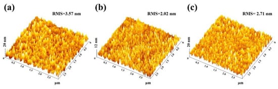 During the magnetron sputtering process, the growth of the Ni/Ni3Al-MoW multilayers was formed by the condensation of a large number of Ni, Al, Mo, and W atoms and corresponding atomic clusters on the surface of the substrate. When the multilayers were sputtered at ambient, without heating the substrate, cone-shaped nano-particles were distributed on the surface without continuous, long trenches or blotches, as shown in Figure 2. It is worth noting that some of the particles are irregularly stacked, forming bright and dark regions with height fluctuation of the particles, which does not exceed 25 nm for the Mo-W doped Ni/Ni3Al multilayers. It indicates that the significant roughness of the surface is presented and varied with the h for the multilayers. The RMS (root-mean-square) surface roughness was calculated by the formulation, as follows []: